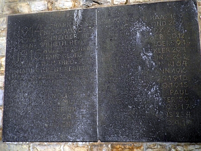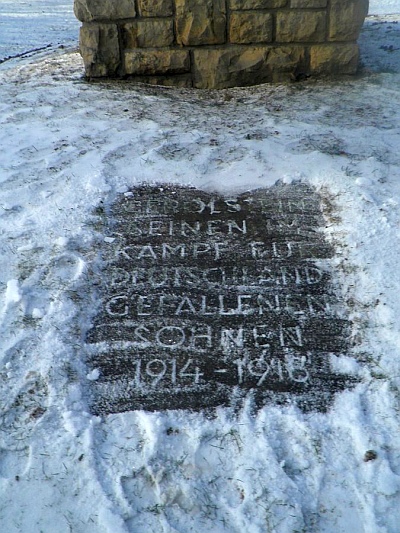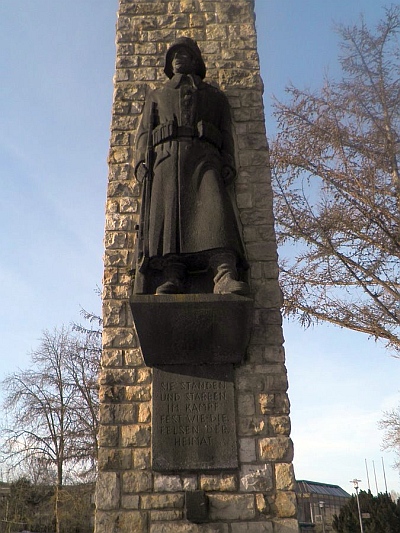 [...] In den Jahren 1923/1924 erwarb die Stadt das Gelände für die stolze Summe von 300000 Reichsmark. Besitzer war Herr Bouchee, Gründer des Hansa-Sprudels. Das Gebäude des Hansa-Sprudels befand sich an der Stelle, an der heute das Rathaus steht. Zu der von der Stadt erworbenen Geländefläche gehörte auch der Bering der Sankt-Josefsschule - heute das Mehrgenerationenhaus. Das Gelände vor dem Hansa-Sprudel wurde zu einer städtischen Anlage und nach dem ehemaligen Reichspräsidenten Paul von Hindenburg benannt. 1936 wurde das Ehrenmal für die Gefallenen des Ersten Weltkrieges (1914-1918) auf dem Platz errichtet. Wegen des schlechten Untergrundes steht das Ehrenmal auf eingerammten Eichenpfählen. Am Denkmal selbst findet man zwei große Gedenktafeln mit den Namen der Gefallenen, vor dem Denkmal sind zwei weitere kleinere Tafeln mit den Inschriften: "Gerolstein seinen im Kampf gefallenen Söhnen 1914 - 1918" und "Sie standen und starben im Kampf- wie die Felsen der Heimat".