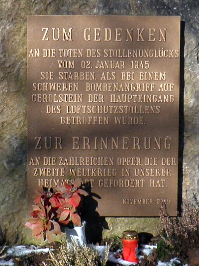 Am Dienstag, dem 02. Januar 1945 wurde in Gerolstein durch Bombenabwurf ein Luftschutzstollen verschüttet. 51 von 52 Menschen, die im Stollen waren, kamen dabei ums Leben. Der einzige Überlebende, Josef Weber, geb. am 21. März 1920, wohnhaft in Gerolstein-Lissingen, Prümer Straße, sagt darüber aus: