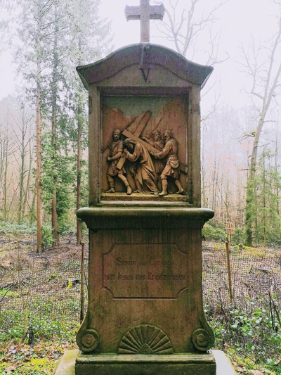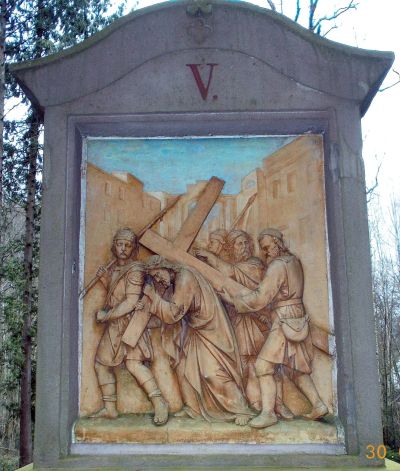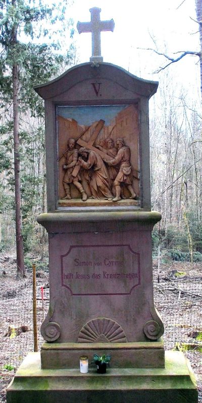 Der Stationenweg wurde 1899 anstelle eines 1857 genannten errichtet. Neubarocke, etwas über zwei Meter hohe übergiebelte Reliefnischen auf Pfeilern. Die Stationendarstellungen sind jeweils in flach- bis halbplastisch abgestuften Szenen herausgearbeitet. [1]