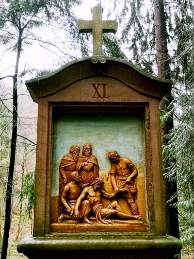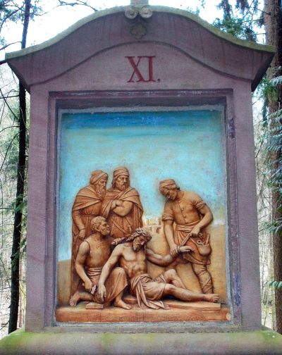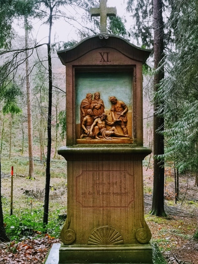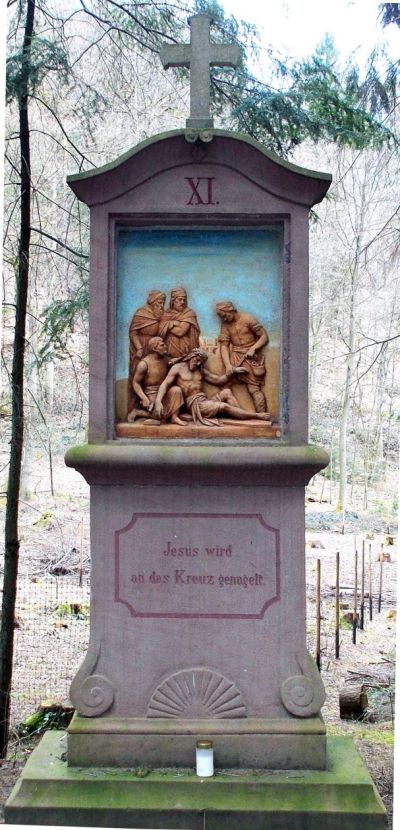 Der Stationenweg wurde 1899 anstelle eines 1857 genannten errichtet. Neubarocke, etwas über zwei Meter hohe übergiebelte Reliefnischen auf Pfeilern. Die Stationendarstellungen sind jeweils in flach- bis halbplastisch abgestuften Szenen herausgearbeitet. [1]