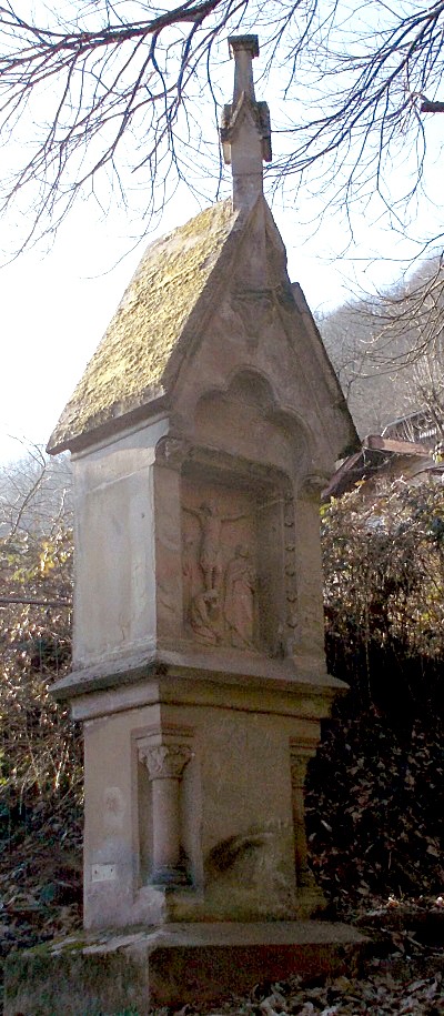 Neugotische altarartige Bildstöcke aus hellem Sandstein mit Mensa mit säulenbewehrten Kanten, in eine Dreipassblende eingelassene Tonreliefs mit nazarenischem Duktus, abgeschlossen von steilem Giebeldach mit diagonal gestellter Mittelfiale, die beschädigten Reliefs 2001/02 mit Hilfe der Trier-Gesellschaft e. V. wiederhergestellt.