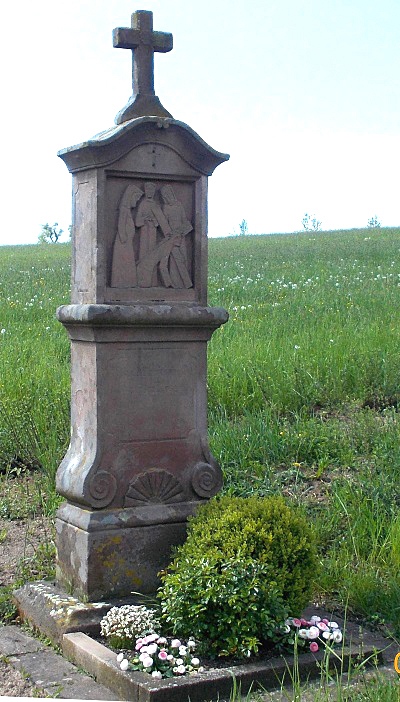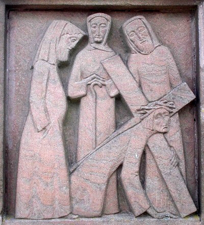 7. Station: Jesus fällt zum zweiten Male unter dem Kreuz. Die 14 Stationen sind gleichartige neubarocke Sandsteinpfeiler mit segmentartig geschlossenen Rahmungen für erneuerte Reliefplatten. [1]