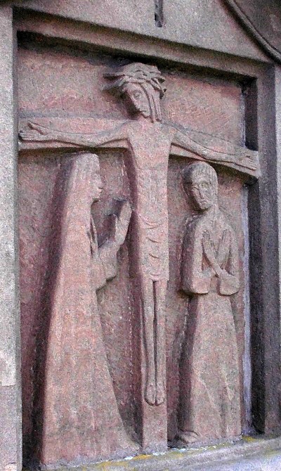 12. Station: Jesus stirbt am Kreuze. Die 14 Stationen sind gleichartige neubarocke Sandsteinpfeiler mit segmentartig geschlossenen Rahmungen für erneuerte Reliefplatten. [1]