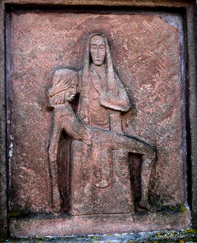 13. Station: Jesus wird in den Schoß seiner Mutter gelegt. Die 14 Stationen sind gleichartige neubarocke Sandsteinpfeiler mit segmentartig geschlossenen Rahmungen für erneuerte Reliefplatten. [1]