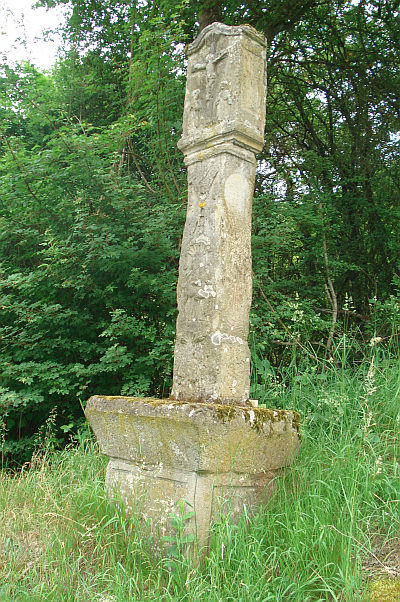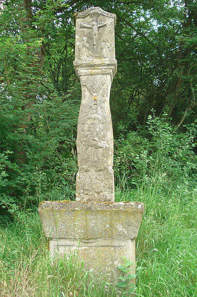 Auf Steinaltar stehender Kreuzbildstock aus Sandstein, wohl um 1810 errichtet; den leicht gebauchten Schaft überziehen außer den üblichen Reliefdarstellungen mit den Leidenswerkzeugen zwei Mariendarstellungen, einmal als Halbfigur und einmal als Pietà. Der Aufsatz mit schlichtem Kreuzigungsrelief und Beifiguren. Das 2,7 m hohes Kreuz in Zusammensetzung mit dem Altarsockel, der formalen Ausbildung und der bilderreichen Formsprache ähnlich dem Bildstock am Fußweg zur Nitteler Sankt Rochuskapelle. [1]