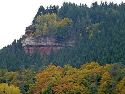 Dort, wo in den oberen Bereichen grobe und sehr harte Schichten von Gesteinsschutt (Konglomeratzone) auftreten, blieb das Gestein, zum Beispiel Geyersley, Hochburg - vor stärkerer Abtragung bewahrt. Von diesen Felsgebilden aus bietet sich ein weiter Blick über das bewaldete Kylltal.