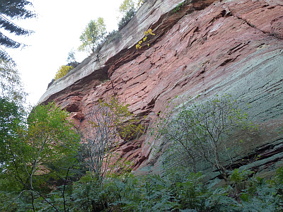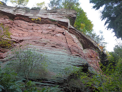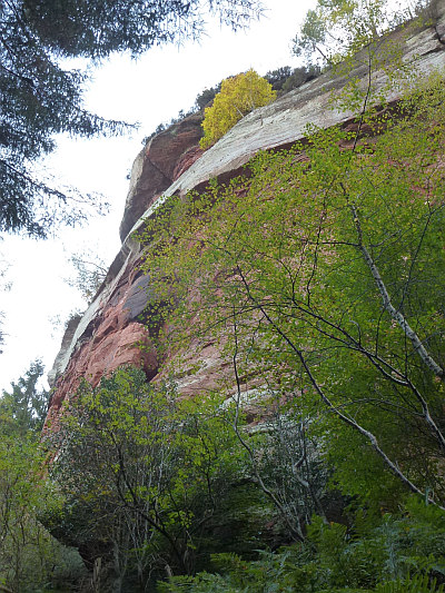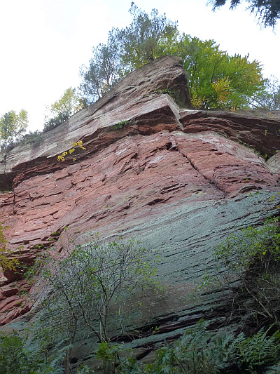 Charakteristisch für das untere Kylltal sind die steilen wand- und rippenartig hervortretenden Wände aus rotem Buntsandstein, die von der erodierenden Kraft des Flusses herausmodelliert .