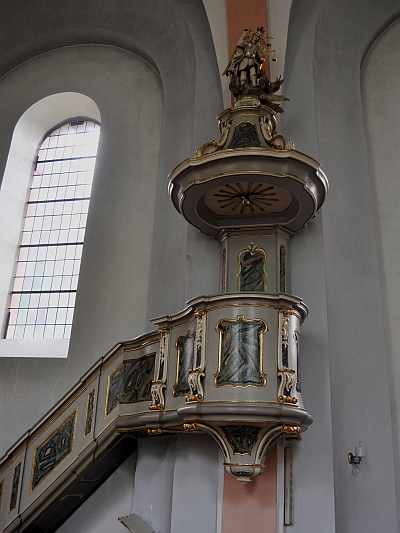 Die runde Kanzel mit Volutenstegen auf den Kanten und etwas Rokokoschnitzwerk. Der Schalldeckel mit Aufbau für die Figur des Erzengels Michael. [1]