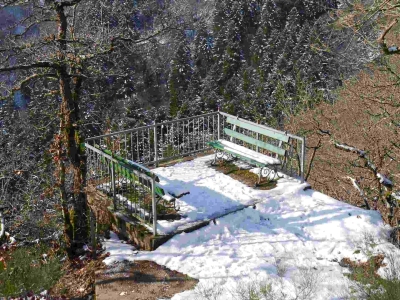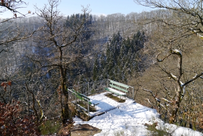 Der Aussichtspunkt Pellenzkanzel liegt nur einen Steinwurf von der Schmitthütte entfernt auf einem Felsen oberhalb des Burgweihers. Herrliche Aussicht auf den Burgweiher und den Berg, um den sich der gräfliche Fischweiher, gespeist vom Wasser der Lieser, windet.