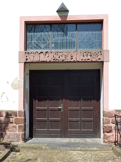 Satteldachbau mit Thermenfenstern und Glockengestell, 1954, Architekt F. Thoma (Umbau einer Reithalle des frühen 20. Jahrhunderts), geometrische Buntglasfenster 1954 von Reinhard Heß, figürliche 1962/63 von Heinrich Dieckmann. [1]