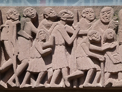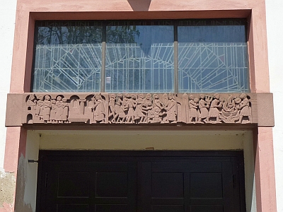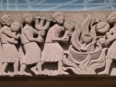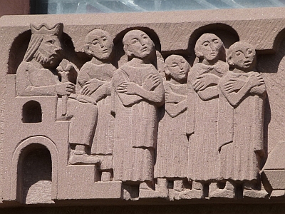 [...] Johannes Albert Zapp hat sie als einer seiner letzten Werke gemacht. Er starb im Dezember 1963 an den Folgen eines schweren Verkehrsunfalls im Alter von 49 Jahren. Typisch für seine meistens in Sandstein gehaltenen Werke war ein klarer Stil, wenig Faltenwurf, sehr abstrahiert und glatt. Mein Vater hat in seinem kutzen künstlerischen Schaffen von nur etwa zehn Jahren viele Aufträge für die Katholische Kirchengemeinde ausgeführt, nicht nur in Trier, sondern auch im Saarland, z.B. das Mosaik mit dem Hl. Nikolaus im Krankenhaus in Wallerfangen, der Sankt Josef in der Rodener Kirche, die Mariengrotte auf dem Hasenberg in Ensdorf und weitere Exponate im öffentlichen Raum. In der Kirche auf der Hermann-Röchling-Höhe hat er die Entwürfe für die beiden bunten Glasfenster gemacht. [2]