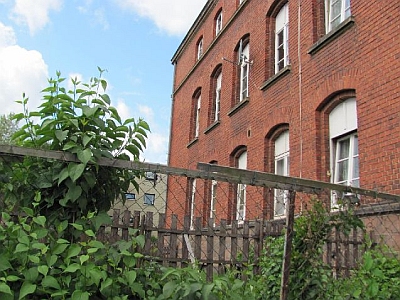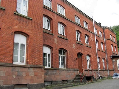 Rest des Baubestandes der ehemaligen Hornkaserne; dreigeschossiger Backsteinbau mit Walmdach auf H-förmigem Grundriss. [1]