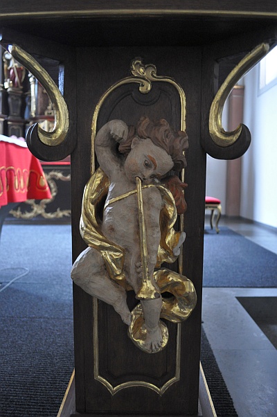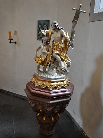 Taufstein aus der alten Kirche in Forst, Amt Bruchsal, "mit Rokokoschmuck"; der Deckelaufsatz (Eichenholz, ungünstig renoviert) mit einer Darstellung der Taufe Christi.[1]