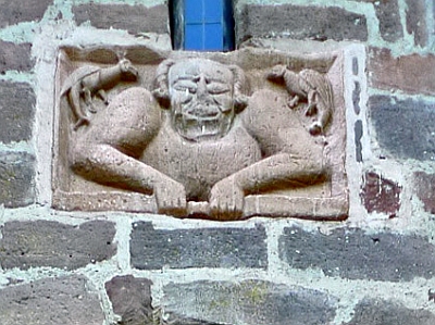 Über dem Haupttor der Bertradaburg in Mürlenbach an der Kyll in der Eifel ist dieses Relief, zur Abwehr einer Gefahr von außen, eingelassen. Es soll den nordischen Gottvater Odin darstellen, der auch Hrafnagud, was Rabengott bedeutet, genannt wurde. Er hatte als ständige Begleiter die beiden Raben Huginn (göttlicher Gedanke) und Muninn (göttliches Gedächtnis) zur Seite. Auch wenn sie nicht unbedingt wie Raben aussehen, halte ich den Bezug zur Germanischen Mythologie für sehr wahrscheinlich. [1]