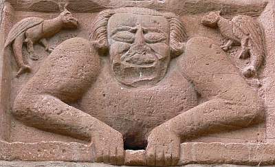 Die roh gearbeitete Skulptur befindet sich auf einer alten Photographie noch an ihrer Stelle. Dargestellt ist der Oberkörper eines nackten, wild aussehenden Mannes, der, auf seine Arme gestützt, wie aus einer Öffnung drohend herausschaut. Nach der symmetrischen Armhaltung scheint das konisch gearbeitete 10 cm breite Loch zwischen den Händen zum Einstecken eines Balkens als Lichtträger gedient zu haben. Die Haare sind symmetrisch gescheitelt, die Augen besonders groß dargestellt. Die riesige Nase ist abgeschlagen, ebenso die Kinnpartie fast ganz. Drachen und Basilisk in den freien oberen Ecken unterstützen die drohende Fratze in ihrer Aufgabe, Feinde und feindliche Gesinnung abzuwehren. [2]