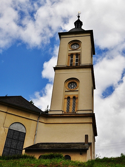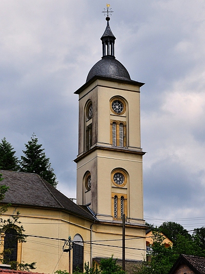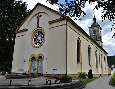 Die Kirche Sankt Michael wurde in den Jahren 1838/39 erbaut. Es ist ein saalartiger Bau mit großen Bogenfenstern, der Turm ist an der Ostseite angebaut. Im Inneren sieht man die nach innen eingezogenen Strebepfeiler, auf die runde Halbsäulen gesetzt sind. Die Holzdecke wurde 1966-68 eingezogen. Im Altarraum steht ein klassizistischer Säulenaltar; die Fenster auf der linken Seite stammen noch aus der Erbauungszeit, ebenso der Taufstein und die Bänke. [2]