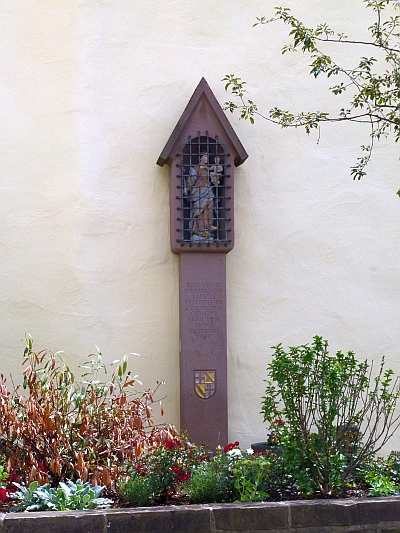 [...] An der Ecke Brunnenstraße / Zum Schloßpark, wo bis 1960 die Corneliuskapelle stand, wurde im April 1977 zur Erinnerung an dieses Gotteshaus ein Marienbildstock errichtet. Der Bildstock wurde aus rotem Sandstein von Steinmetz Theo Schäfer aus der Engelstraße gefertigt. Die Beschriftung nahm der Kürenzer Bildhauer Theo Kronewirth [...] kostenlos vor. Der Erinnerungstext lautet: