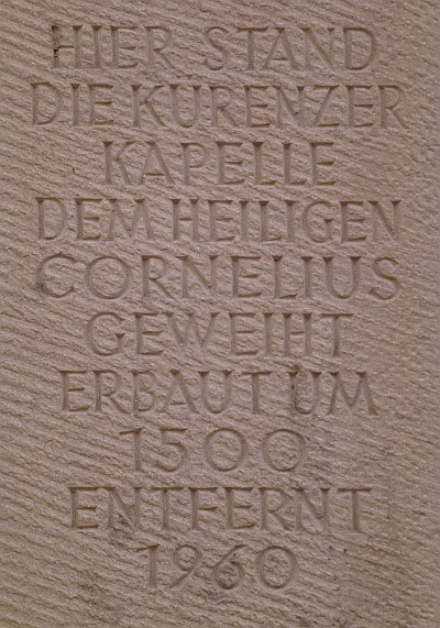 Darunter ist das Badische Wappen eingemeißelt. Die Inschrift verkennt jedoch die Tatsache, daß an dieser Stelle nacheinander zwei Kapellen standen, die beide dem heiligen Cornelius geweiht waren. Die um 1500 errichtete, wahrscheinlich spätgotische Kapelle wurde 1854 abgerissen, um Platz für die neue Cornelius-Kapelle zu schaffen, mit deren Bau noch im selben Jahr begonnen wurde. [...]
