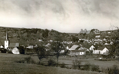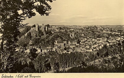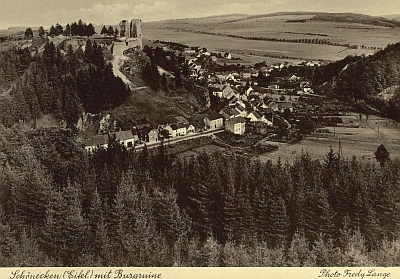 Schönecken-Wetteldorf (Wathiliendorp) kam wahrscheinlich 762 durch Schenkung des Königs Pippin an das Salvatorkloster zu Prüm. Das Dorf Schönecken wird in einem Zinsbuch des Abtes von 993 erwähnt. Das feste Schloss Sconecke oder Bellecoste (Bellacosta) wurde vermutlich erst später, nicht lange vor 1222 erbaut. Im Jahre 1246 oder 1247 weilten Albertus Magnus und Erzbischof Konrad von Hochstaden (Erbauer des Kölner Doms) längere Zeit bei dem Grafen Heinrich I. von Vianden auf der Burg. Gegen 1370 kam sie an Luxemburg und wurde von Kaiser Wenzel nebst den umliegenden Ortschaften im Jahre 1283 dem Erzbischof Cuno von Trier verpfändet. Im Besitz des Trierer Erzstiftes ist sie dann bis 1794 verblieben. 1802 verbrannten Dorf und Teile der Burg; die Steine der von den Franzosen auf Abbruch verkauften Burg dienten zum Wiederaufbau der Wohnungen. Die Burgruine ist heute Eigentum des Landes Rheinland-Pfalz. [1]