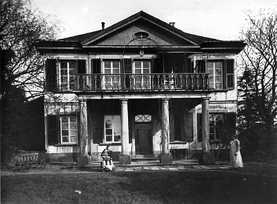 In der Mittelachse des Portikus liegt die Eingangstür mit Oberlicht. Rechts und links des Portals sind je zwei große, hochrechteckige und leicht ins Mauerwerk eingelassene Fenster, die in Gestalt und Größe den 5 Fenstern des Obergeschosses entsprechen. Die beiden etwa gleich hohen Geschosse werden optisch getrennt durch ein umlaufendes Gesimsband, das in Höhe des Portikusgebälks verläuft. Ein breites, auskragendes Gesims trägt das relativ massige Walmdach, die Gartenseite wird von einem Dreiecksgiebel mit zentralem, querovalem Okulus geziert. Die Grundfläche des Gebäudes war circa 10 x 6 m, die Höhe bis zum Dachgesims ebenfalls circa 6 m.