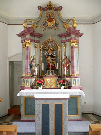 Einfacher Säulenaltar des 18. Jahrhundert mit Nische für die etwa 80 cm hohe Holzfigur einer schmerzhaften Muttergottes des 18. Jahrhunderts, in einfacher Arbeit und mit Konsölchen für die Figuren des heilgen Petrus und des heiligen Papstes Cornelius.