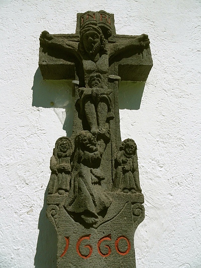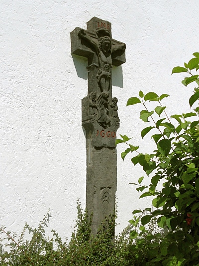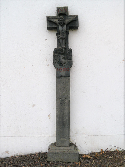 Romanischer Westturm, barock verändert, neugotische Halle, 1912/13; Schaftkreuz, Basalt, bezeichnet 1660; weiteres Schaftkreuz, Basalt, bezeichnet 1660; sogenanntes Christustempelchen, Baldachinbau, bezeichnet 1708. [1]