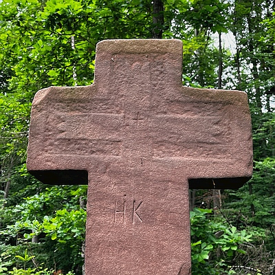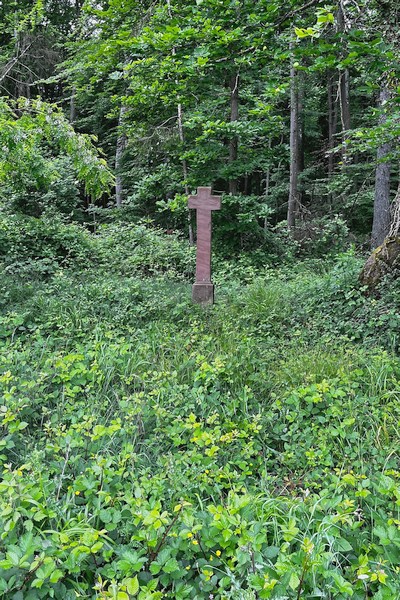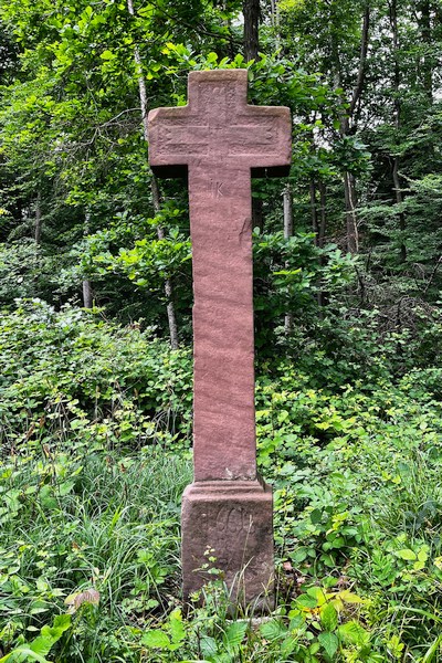 Weit außerhalb und nur schwer zu finden steht dieses Kreuz am Waldrand des "Jungenwaldes". Aufgrund der schief gearbeiteten Kreuzbalken kann davon ausgegangen werden, dass das Kreuz nicht von einem Steinmetz gefertigt wurde, sondern das Werk des Errichters selbst ist, welches hier Aufstellung gefunden hat. Wie man anhand der Ähnlichkeit zu anderen Kreuzen der der Umgebung schließen kann, handelt es sich sehr wahrscheinlich auch bei diesem Kreuz um ein Totengedächtniskreuz, das zum Andenken an einen hier Verunglückten errichtet wurde. Die über dem Datum eingeritzten Initialen deuten dabei auf den unbekannten Stifter des Kreuzes hin. [3]