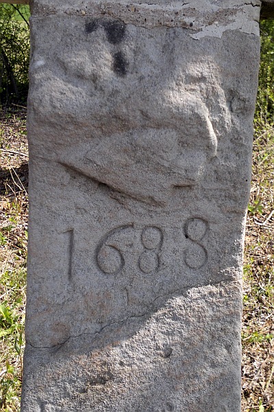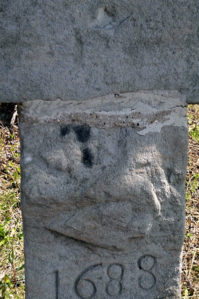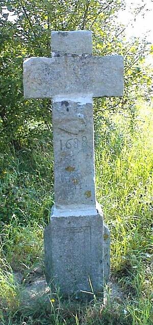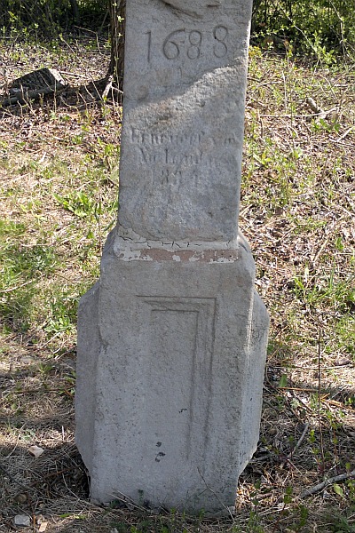 Balkenkreuz, dem im flachen Relief nochmals ein Kreuz eingearbeitet ist; am Schaft eine Pflugschar und die Datierung 1688, darunter das Jahr der Wiederherstellung 1884; den Schaftfuß schmücken an der Vorderseite eine Spiegelvertiefung und an den Seitenflächen Diamantbossen. [1]