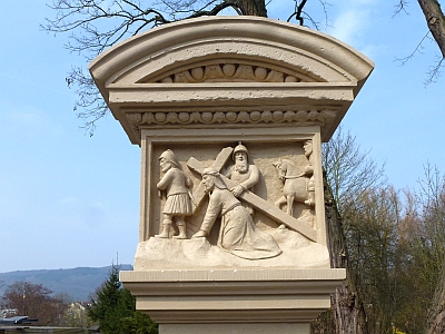 Die "sieben Fußfälle" als Urform des Kreuzwegs wurden im 17. Jahrhundert vermutlich unter dem Domvikar Anton Wiltz angelegt. Einige der Stationen, die sich im Besitz der Pfarrgemeinde von Heiligkreuz befinden, wurden 1850 durch den Trierer Bildhauer Georg Leonardy überarbeitet oder erneuert.