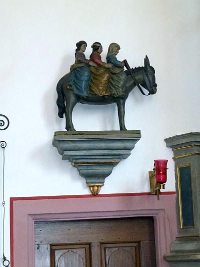 Zwischen [dem Marienaltar] und dem Hochaltar befindet sich die Tür zur Sakristei. An sich nichts besonderes, doch wird dem Betrachter die merkwürdige Figur eines Esels oberhalb der Tür auffallen. Er trägt drei Frauen, eine hat die Augen verbunden. Dieses Bildnis aus dem 16. Jahrhundert geht auf eine Sage zurück, die man sich in Auw seit langem erzählt. Demnach sind die drei Jungfrauen Irmina, Adela und Klothildis auf der Flucht vor ihrem Vater von einer Klippe über die Kyll gesprungen und an der Stelle des heutigen Auw sicher gelandet. Da sie bei ihrem Sprung auf die Fürsprache der Muttergottes hofften und heil im Tal ankamen, errichteten sie dort ein Kirchlein zu Ehren der Muttergottes. 1952 inszenierte der bekannte Eifeldichter Bernhard Lemling ein auf dieser Sage aufbauendes Freilichtspiel unter dem Titel "Die drei Jungfrauen von Auw". Mit dem Erlös der Aufführungen wurden Kriegsschäden an der Kirche repariert. [1]
