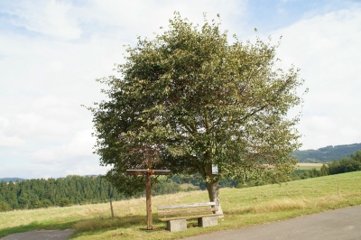 Eichenkreuz. [...] An dieser Stelle stand bereits seit 1871 ein Kreuz, das mehrmals erneuert wurde, aber seit Jahren verfallen und verschwunden war. Es trug die Inschrifttafel:"Errichtet von Matthias Breidt aus Geisfeld zum Dank gegen Gott für den Schutz im Feldzug 1870/71." Mathias Breidt nahm damals an dem Feldzug gegen Frankreich teil. Als er gesund zurückkehrte, ließ er dieses Kreuz errichten, das nach seinem Hausnamen Ämeskreuz genannt wurde. [1]