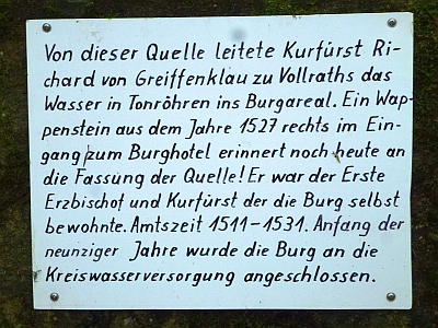 Von dieser Quelle leitete Kurfürst Richard von Greiffenklau zu Vollraths das Wasser in Tonröhren ins Burgareal. Ein Wappenstein aus dem Jahre 1527 rechts im Eingang zum Burghotel erinnert noch heute an die Fassung der Quelle! Er war der Erste Erzbischof und Kurfürst der die Burg selbst bewohnte. Amtszeit 1511-1531. Anfang der neunziger Jahre wurde die Burg an die Kreiswasserversorgung angeschlossen. [1]