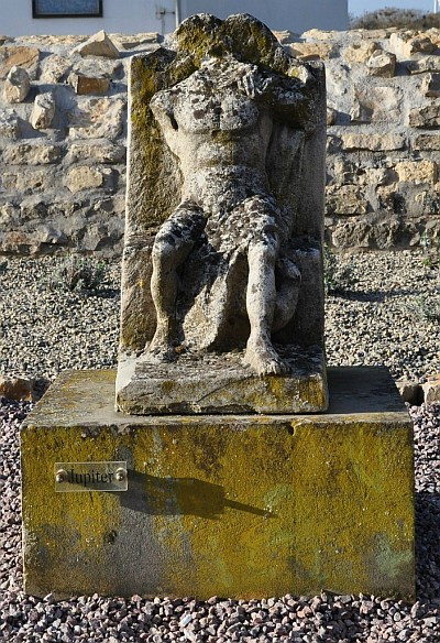 Diese Statuette eines sitzenden Jupiters fand man im Jahre 1874 in einem römischen Brunnen an der Römerstraße im nördlichen Bereich des Vicus Beda. Die Figur soll einst neben dem Brunnenauf der Straße gestanden haben. An der Figur fehlen der Kopf, der rechte Arm und die Hälfte des linken Unterarms. Jupiter sitzt breitbeinig auf dem Thron, indem er den hinter dem linken Arm herabhängenden Mantel über den linken Oberschenkel gelegt hat. Der in einer breiten Zickzacklinie drapierte Zipfel fällt zwischen den Beinen herab. Der rechte Arm war gesenkt. Der linke angehobene Arm ist emporgewinkelt.