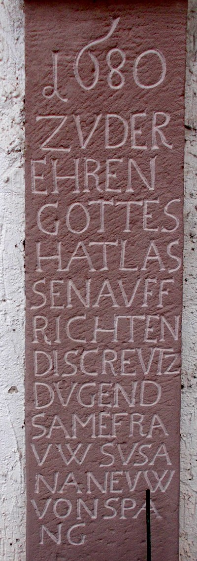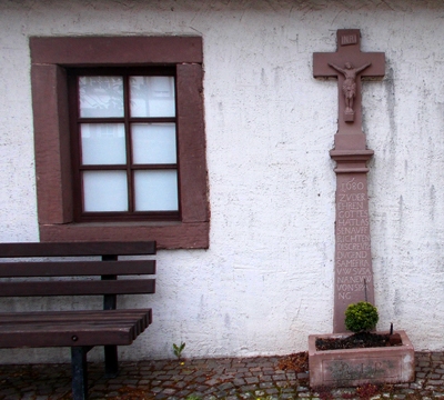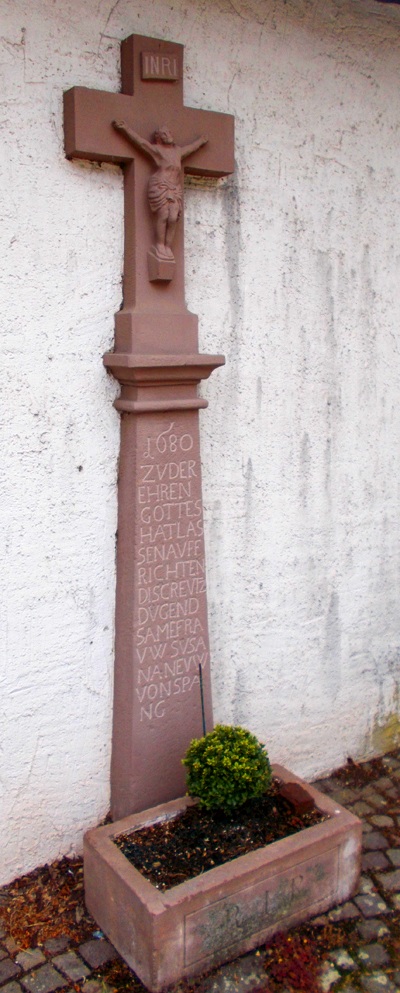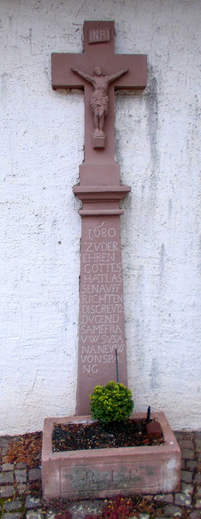 Schaftkreuz aus rotem Sandstein, direkt an Hauswand angefügt.
