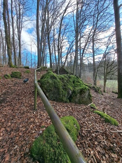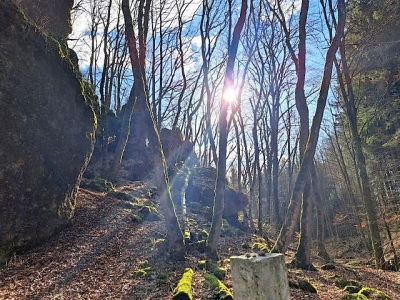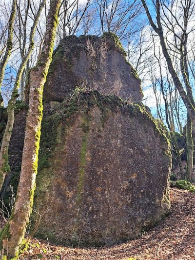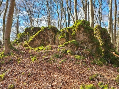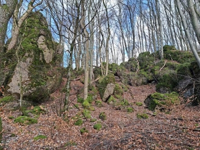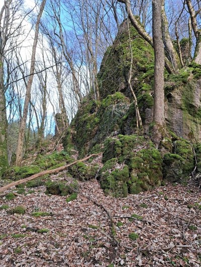 Mächtige Dolomitfelsen inmitten eines wunderschönen Buchenwaldes in einem bizarr unebenen und unübersichtlichen Gelände. [1]