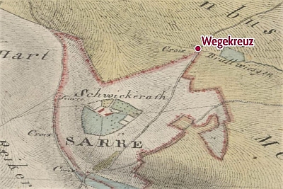 In der Tranchot-Karte von 1811 markiert das Kreuz die Grenze des Hofes. [2]