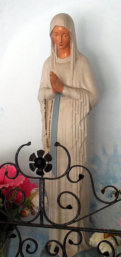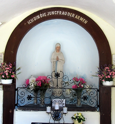 Im Inneren Nische mit Muttergottes-Statue, Ziergitter davor.