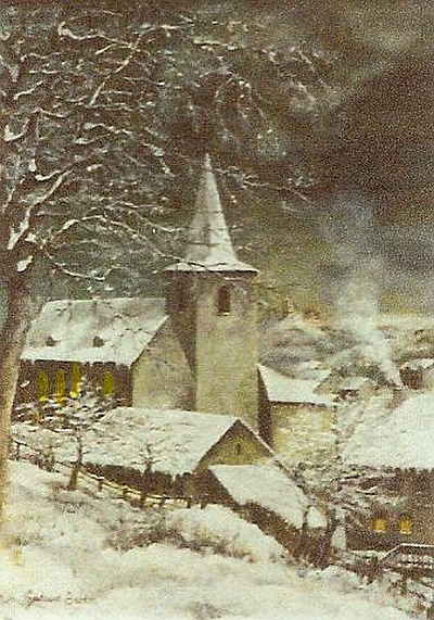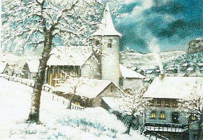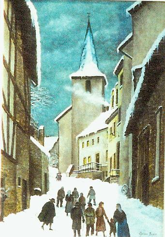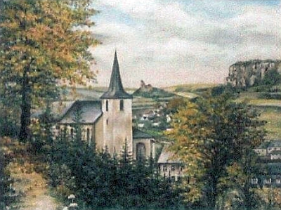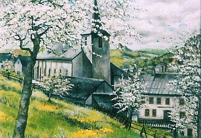 Gertrud Becker zeigt auf ihrem Gemälde unsere Sankt-Anna-Kirche mit dem niedrigen Turm vor 1923 und auch die Fachwerkbauten der Stallungen und Scheunen. Denn auch am "Kirchewääsch" (Kirchenweg), wie die Burgstraße stets genannt wurde, gab es früher außer Grüns auch einige andere landwirtschaftliche Betriebe. Rechts, direkt vor der Kirche sieht man die gemütliche Wirtschaft der Familie Böffgen [Bilder 3 und 4], wo die Männer sich Sonntags nach dem Besuch der heiligen Messe gerne zu einem Gespräch bei einem Bierchen trafen.