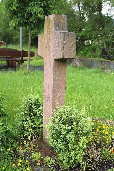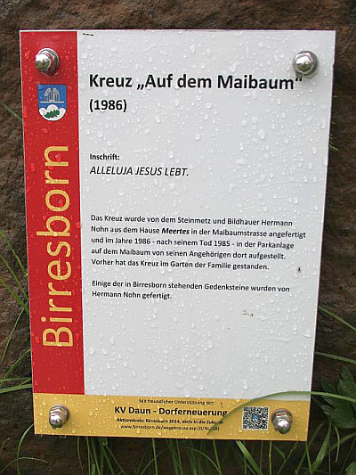 Das Kreuz wurde von dem Steinmetz und Bildhauer Hermann Nohn aus dem Hause Meertes in der Maibaumstrasse angefertigt und im Jahre 1986 nach seinem Tod in der Parkanlage auf dem Maibaum von seinen Angehörigen dort aufgestellt. Vorher hat das Kreuz im Garten der Familie gestanden. [1]