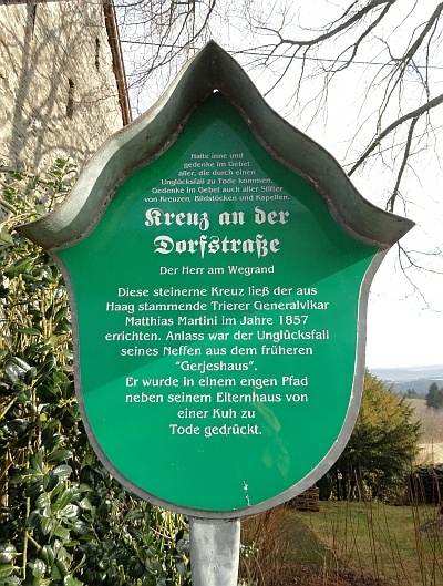 Dies steinerne Kreuz ließ der aus Haag stammende Trierer Generalvikar Matthias Martini im Jahre 1857 errichten. Anlass war ein Unglücksfall seines Neffen aus dem früheren "Gerjeshaus"