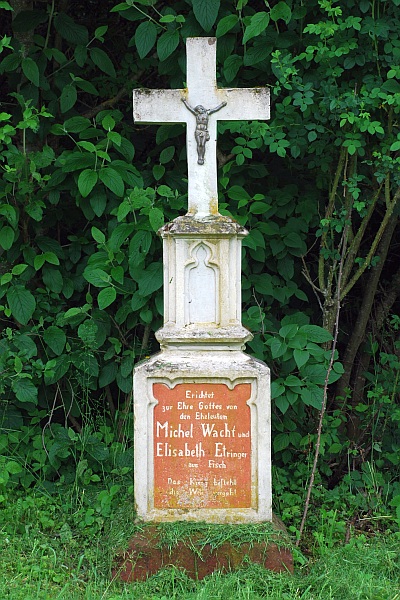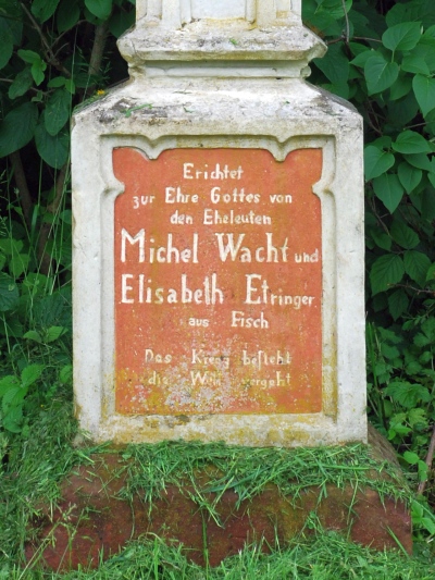 Am Fischer Kirchweg steht rechts in der Nähe der drei Ebereschen auf dem Bickelberg ein Kreuz in Denkmalform. Es hat eine Höhe von über 2 Meter. Unten ein ganz breiter Fuß, der als Sockelstein anzusehen ist. Die Inschrift auf der breiten Schrifttafel: "Errichtet zur Ehre Gottes von den Eheleuten Michel Wacht und Elisabeth Etringer aus Fisch. Die Welt vergeht, das Kreuz besteht." Darüber ist eine kleine Flachnische mit gotischem Maßwerk ausgehauen. Das Abschlusskreuz hoch und mit langem Querarm. Eisencorpus, auf einem Holzkreuz. [1]