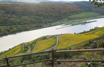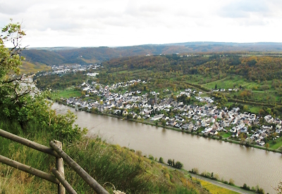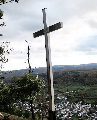 Mächtiges Holzkreuz am Aussichtspunkt am Moselsteig mit Blick ins Moseltal, auf die Ortschaft Wehlen und Staustufe Zeltingen. [1]