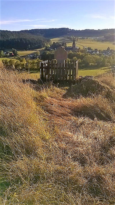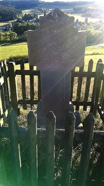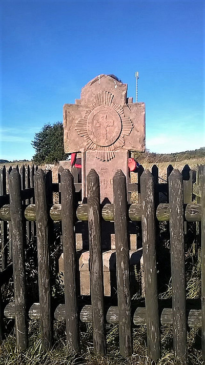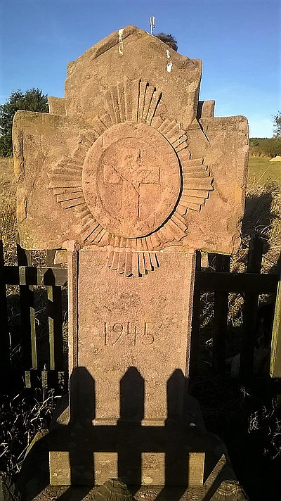 Nach dem Ende des Zweiten Weltkrieges hat ein unbekanntes Ehepaar dieses Gedenkkreuz auf einer Anhöhe in Bolsdorf, Pies, 427 m über dem Meeresspiegel, aufgestellt.