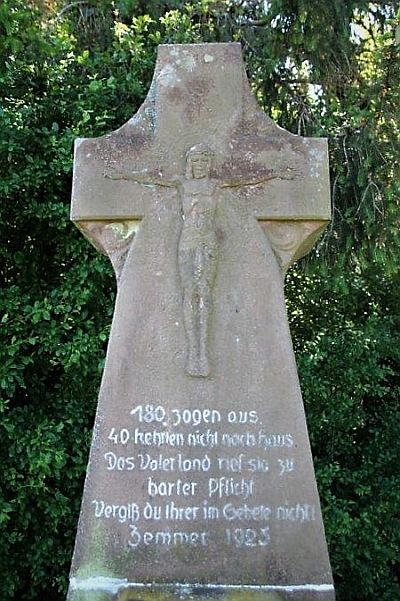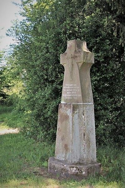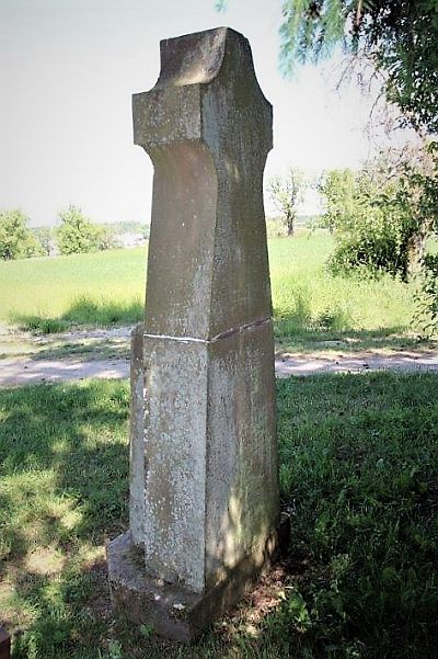 An der Vorderseite eine als Strebepfeiler anlaufende Vorlage. Zwischen den Kreuzbalken Blütenornament und am Schaft die es als Kriegerehrenmal ausweisende Inschrift:
