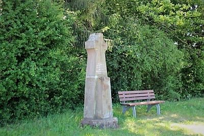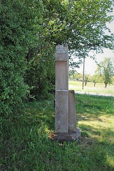 Aus einem Sandsteinblock gearbeiteter Pfeiler, der sich nach oben zum Kreuz mit im Flachrelief herausgearbeitetem Korpus verjüngt.
