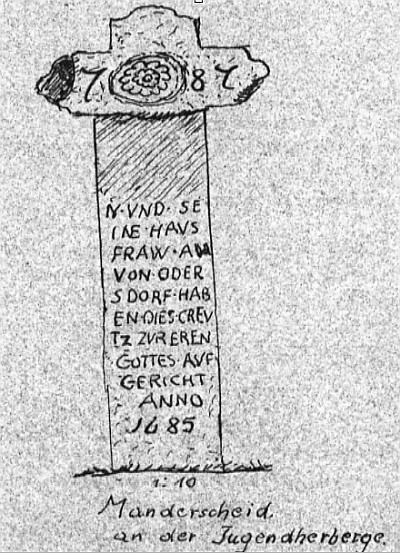 Weder in den Manderscheider noch den Üdersdorfer Steuerlisten gibt es einen Hinweis auf den Stifter, seine Familie oder den Stiftungszweck. Der Standort des Kreuzes lag am mittelalterlichen Weg nach Bettenfeld. Eine Susanne Ostermann wird im Familienteil unter <307> nachgewiesen und dort ergibt sich auch eine Verbindung zu dem bereits genannten Matthias Wirtz! Um 1670/80 ist ein OSTERMANN auf dem Himmeroder Klosterhof "Rodenbüsch" bei Bettenfeld als Hofpächter und Schultheiß der malbergischen Herrschaft Bettenfeld-Meerfeld nachgewiesen. Denkbar ist, dass die Schrift im Laufe der Zeit nachgraviert und irrtümlich verfälscht wurde. Wenn man in der ersten Zeile den waagerechten Balken des "H" durch einen etwas schräg gestellten Balken ersetzt, entsteht ein "M"; dann liest man anstatt "VSTER HAN" = "VSTERMAN". Im Manderscheider oder Bettenfelder "Dialekt" heißt Ostern = "Ustern". Das Rätsel um den Stifter ist damit mit hoher Wahrscheinlichkeit gelöst. Die Hofleute der Himmeroder Höfe waren gottesfürchtige, fromme Leute, deren Hofstellen im Vergleich zu den übrigen Bauern wirtschaftlich hohe Erträge abwarfen und in der Lage waren, Kreuze zu stiften. [1]