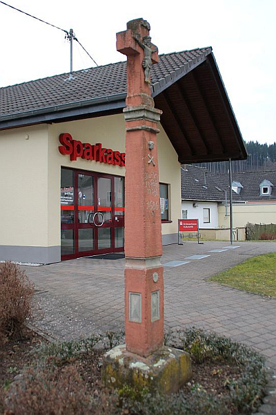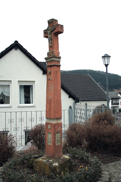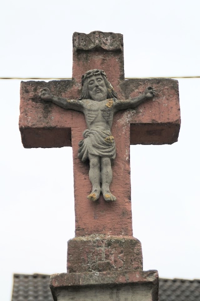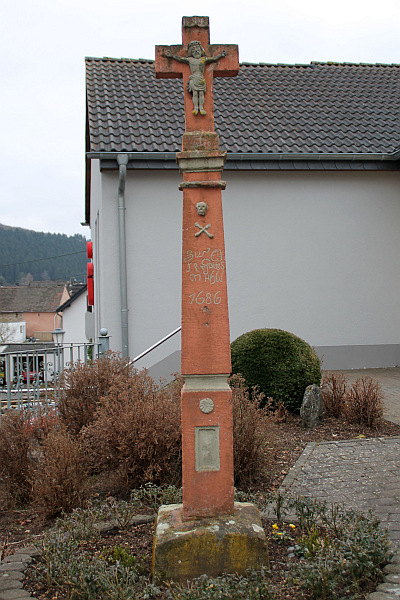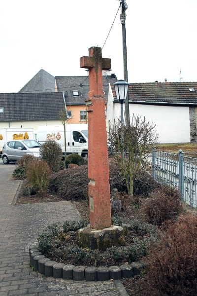 Vermutlich: Im Dorf ist das Kreuz als Pestkreuz bekannt und diese Dorfmeinung ist geschichtlich bestätigt. 1686 war die letzte Pestepidemie im Trierer Land. Sicherlich ist es nach Abklingen der Seuche errichtet worden, als Gedenkstein für die Pesttoten, dies erklärt auch den Totenkopf auf dem Schaftteil. [1]