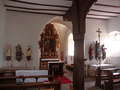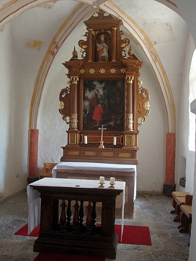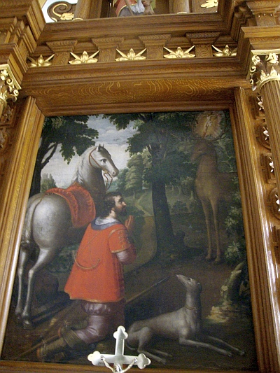 Das Schönste in der Kapelle ist der Hochaltar aus dem Jahre 1755. ein rechteckiger Säulenbau aus Holz mit einem Ölgemälde, das den heiligen Hubertus darstellt, wie er im Walde vor einem Hirsche niederkniet, über dessen Geweih ein Kreuz im Strahlenkranze schwebt.