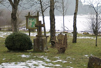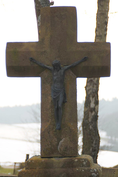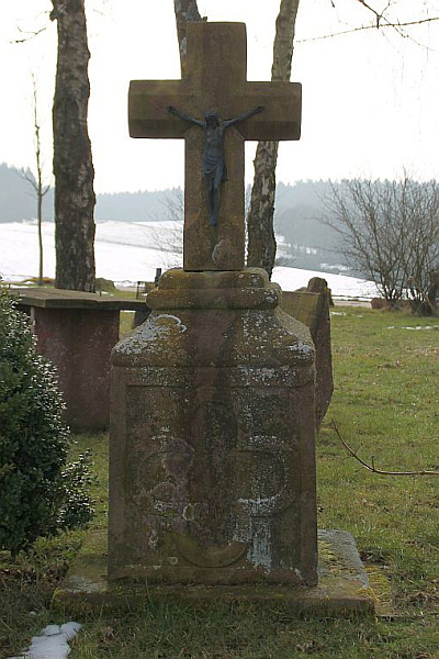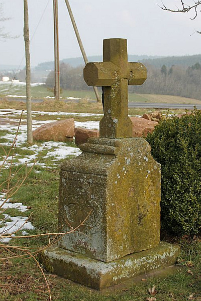 Kleines Balkenkreuz auf fast eben so hohem Sockel. Aufgrund der doppelt gespaltenen Balkenenden und der Form des IHS-Zeichens auf dem Querbalken wohl spätes 18. oder frühes 19. Jahrhundert. [1]