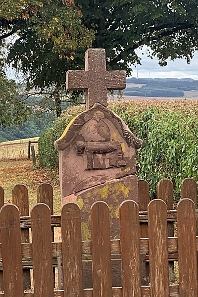 Gut erhaltenes barockes Schaftkreuz auf niedrigem, als kleiner Altartisch nach vorne verlängertem Sockel. Der glatte gerade Schaft am unteren Ende zwiebelförmig verdickt, hier die Jahreszahl 1722. Großes Abschlusskreuz mit Korpus. [1]